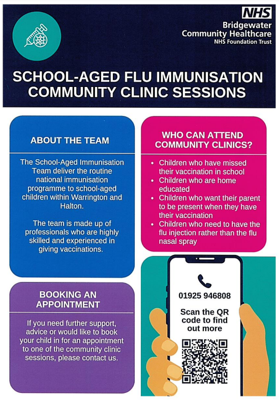 The school nurses came in yesterday to deliver the flu vaccination catch up sessions. If you missed both sessions and would still like your child to have the vaccination, please see the attached flyer for more sessions outside of school.