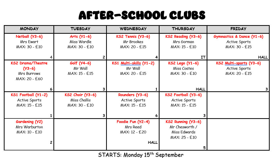A full list of after-school clubs will be published soon. Thanks