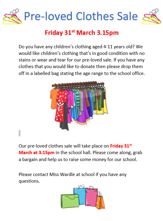 Please join us for our pre-loved clothes sale on Friday 31st March at 3.15pm. Donations to the school office please. Thank you