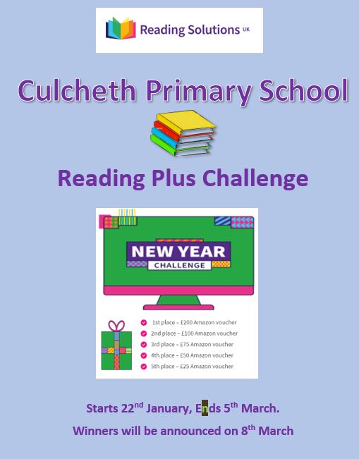 We are taking part in the Reading Plus six-week challenge where the top five schools will win fantastic prizes for school. Starts 22nd January, ends 5th March. Please encourage your child to read at home! Thank-you