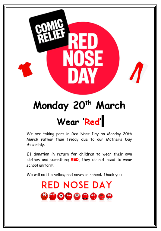 Children to wear Red on Monday 20th March for Red Nose Day. £1 donation