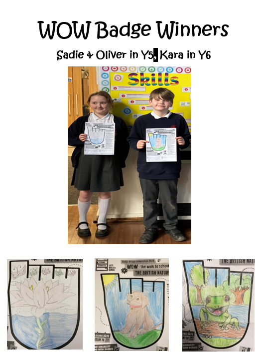 Very well done to Sadie and Oliver in Year 5 and Kara in Year 6 who have won the badge design competition for WOW walk to school challenge. They are now through to the final.